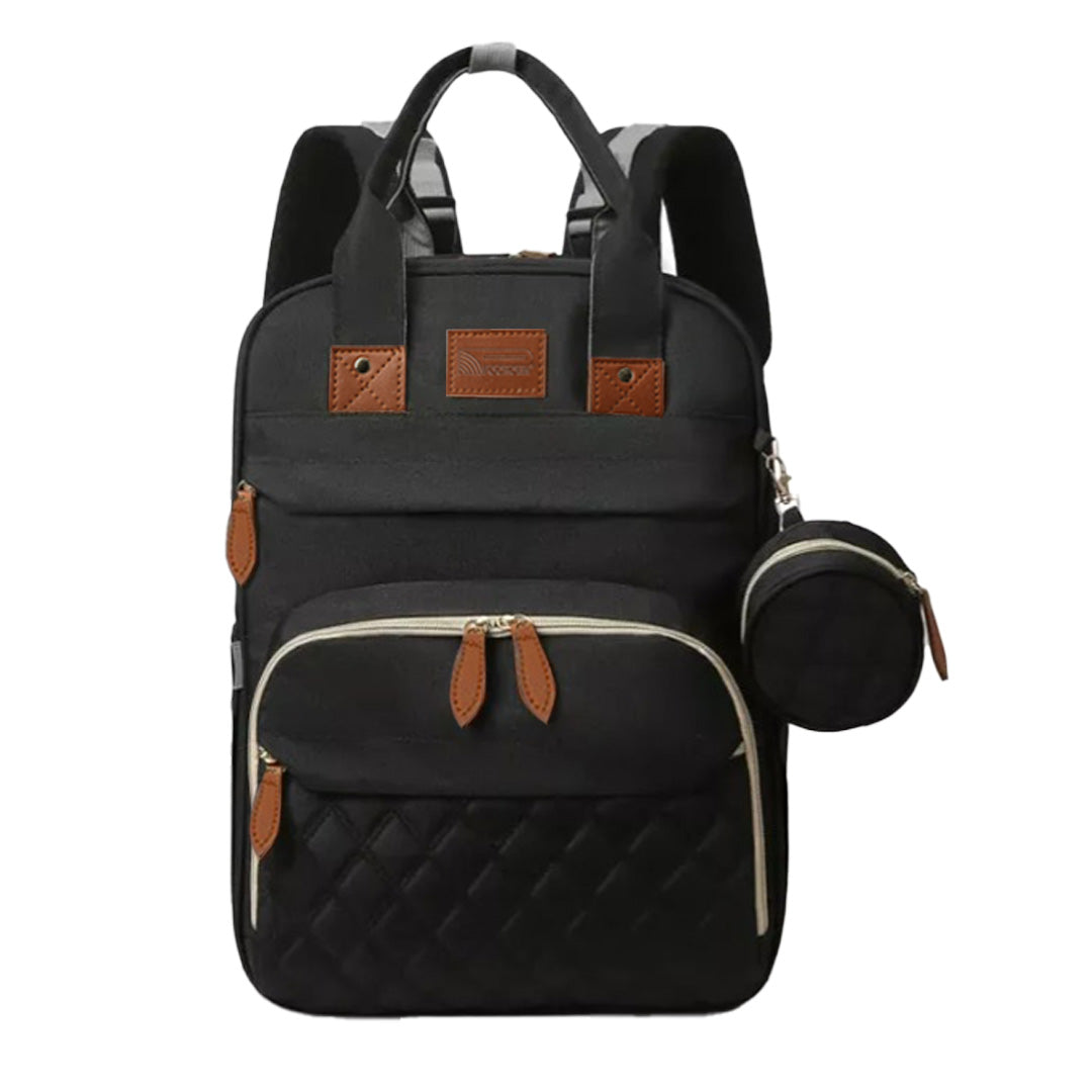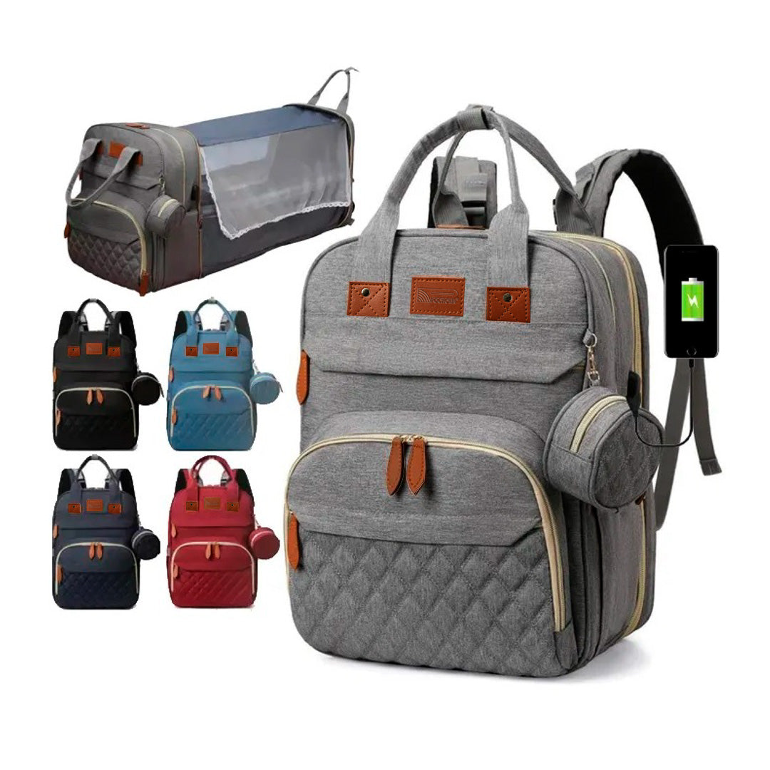 Nuestra Pañalera posee diversas funciones tales como aislamiento térmico para teteros, diferentes compartimientos para cobijas o pañales, cuenta con cable de puerto USB para conectar Power Bank o cargador, porta chupón, compartimiento extensible que se convierte en cama-cuna para bebés de 0 a 6 meses con mosquitero.